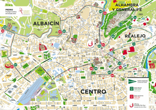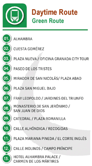 The Green Route: Plaza Nueva / Official Granada City Tour; Paseo de los Tristes; Mirador de San Nicolás / Plaza Abad; Plaza de San Miguel Bajo Plaza de la Romanilla; Calle Alhóndiga / Recogidas; Plaza Mariana Pineda & El Corte Inglés; Calle Molinos & Campo del Príncipe; Hotel Alhambra Palace / Carmen de los Mártires; Cuesta Gomérez; Alhambra.