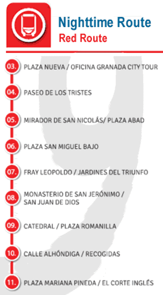 The Red Route: Plaza Nueva / Official Granada City Tour; Paseo de los Tristes; Mirador de San Nicolás / Plaza Abad; Plaza de San Miguel Bajo; Fray Leopoldo & Jardines del Triunfo; Monasterio de San Jerónimo & San Juan de Dios; Catedral & Plaza de la Romanilla; Calle Alhóndiga & Recogidas; Plaza Mariana Pineda & El Corte Inglés.