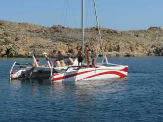 The catamaran and the staff is just in the entry of Fornells, where there is also a big free parking space. You will see the kayaks and bikes by the door.