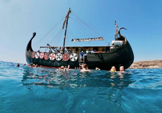 The 3-hour cruise also includes a swim stop where you can enjoy the warm Atlantic Ocean. The ship’s Bar is open throughout the cruise, offering warm food with vegan and vegetarian options. All food cost extra. During the entire cruise, the crew will take care of your comfort & safety and what’s most important – they provide you with lots of fun! The Vikings present sword handling show, you will have the opportunity to try some original costumes from the Viking era and taking souvenir photo on the throne of Ragnar himself.