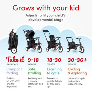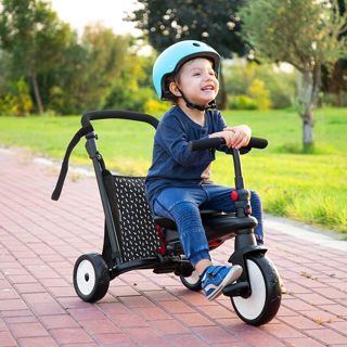 This 7 in 1 trike has 7 stages so the trike grows with your baby from a baby push trike to an independent toddler tricycle, helping them develop motor skills, confidence and balance. Babies can learn how to steer and pedal while the parent is in control. The Control Button on the front wheel mudguard allows parents to easily switch control over to the baby and back again when they get tired. Guaranteed additional comfort with patented shock absorbers and cool looking, durable EVA wheels so you can enjoy a smooth and comfortable ride with no punctures.